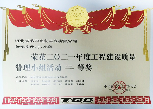 10月中旬,公司收到中国施工企业管理协会《关于公布2021年工程建设优秀质量管理小组的通知》,在中国施工企业管理协会工程建设质量管理竞赛中,七分公司壮志凌云QC小组经过初赛、复赛、决赛三个阶段比拼,最终荣获二等奖。